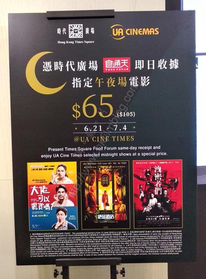 上圖所見,便是「講。鏟。片」情報人員日前於UA Cine Times大堂拍攝到的優惠,可以看到在六月二十一日至七月四日期間,憑時代廣場食通天即日收據,便可以六十五元來觀午夜場電影。然而,有關優惠並不是每部午夜場電影也適用。觀乎上圖所見,適用電影僅限於三部於六月廿一日開畫的電影,當中包括安樂發行的泰國電影《大佬可以退貨嗎?》、英皇與娛藝發行的《絕命酒店》,以及中國3D發行的《洩密者們》。