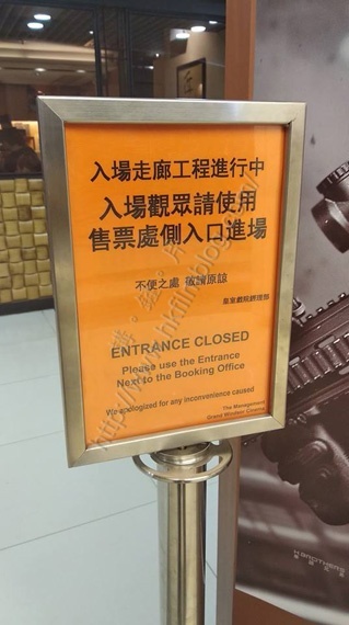 戲院同時張貼了通告,指該戲院入場走廊工程進行中,入場觀眾需使用售票處側入口進場,也是本來散場的位置。