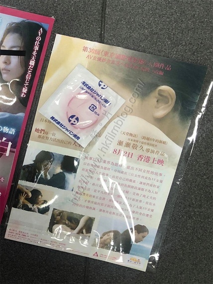 至於背面,用回中文寫上了電影《AV女優的告白》的劇情介紹,但是更為有趣的是,在其宣傳品上同時附上安全套一個。未知有沒有觀眾在觀畢這部電影之後,便即席善用其附送的物品來享受一番。