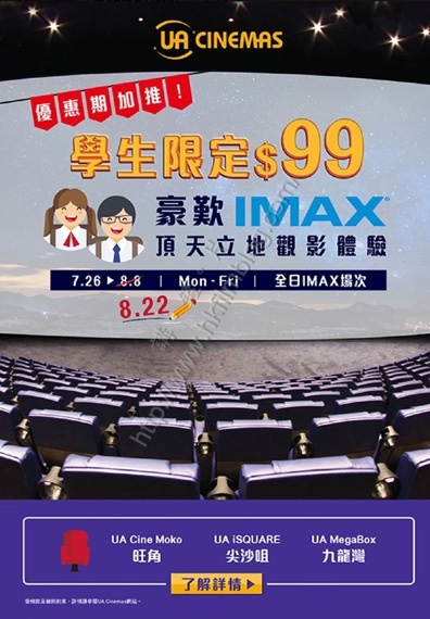 近期UA院線對於學生市場看來相當進取,當中過去兩周便為學生提供99元的平日IMAX影院的優惠。正當有關優惠原於明天後便會結束,不過看來有關院線有意加推,並且將其優惠延長兩周。