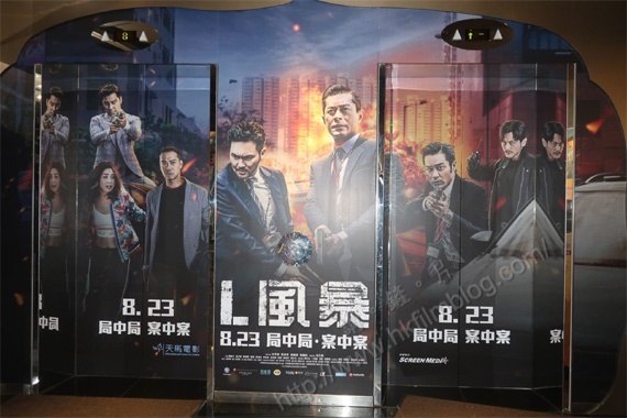 上圖所見,便是天馬發行、黃百鳴監製、林德祿執導,擬於八月廿三日在港上映的《L風暴》在旺角Cinema City朗豪坊戲院升降機大堂位置。可以看到這個特別設計的宣傳品,當中中央部份為兩位主角古天樂與張智霖,右方則有謝天華、鄧麗欣與譚耀文,右方則有鄭嘉穎與栢天男。七位演員在位置上看來遷就了現場環境,至少沒有出現「斷頭」的狀況。