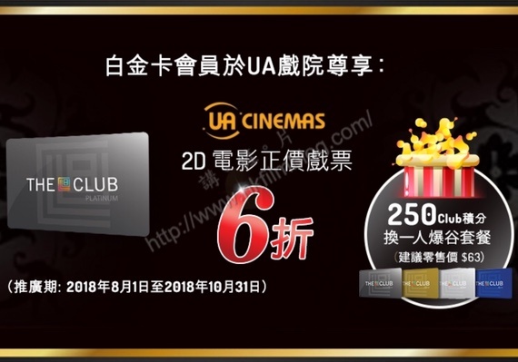 上圖所見,便是The Club會員的最新優惠,觀眾在出示The Club 白金會咭卡,於八月一日至十月三十一日期間,在UA院線購買2D電影正價戲票,便可獲得六折優惠。而同時The Club會員可以250 Club積分,可以換取一人爆谷套餐。