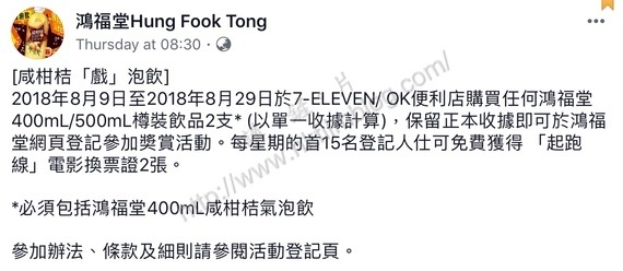 在觀乎鴻福堂品牌的官方Facebook專頁,可以看到該品牌將於八月九日至廿九日舉辦推廣活動,當中觀眾到指定便利店購買指定樽裝飲品兩支,保留收據到其網頁登記參加獎賞活動。而每星期的首十五位登記人士,便可免費獲得電影《起跑線》電影換票證兩張。