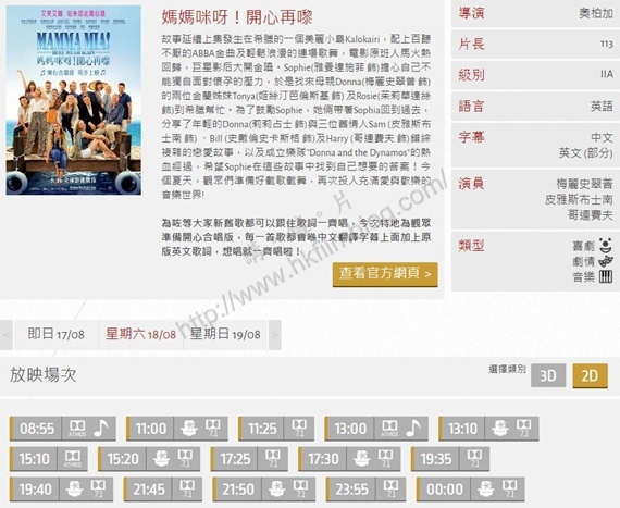 上圖所見,便是來自九龍站The Grand戲院官方網站的截圖,可以看到該戲院放映的《媽媽咪呀!開心再嚟》除了提供普通版本外,還提供了「開心合唱版」,而該版本每首歌曲在中文字幕之上,會配上原版英文歌詞,以便觀眾可以一起來唱。