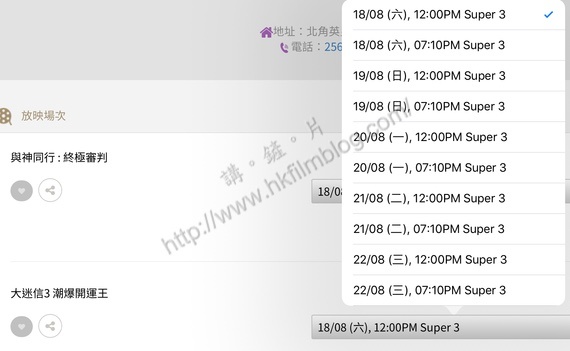 上圖所見,便是購票通網站新光戲院大劇場Super 3三面幕影院預告的情況,當中包括了三月一日上映的《大迷信3潮爆開運王》,而且每天還要選映兩場。