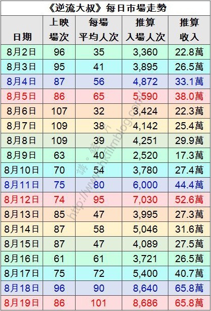 上圖所見,便是電影《逆流大叔》自開畫以來的市場表現。可以看到第三周的首天場次曾一度縮至61場,但在周五已經回升至至70場,而周末與周日場次亦有上升。有趣的是,在電影上映的第三個周四至周日期間,《逆流大叔》的場次卻較第二周為多,這個情況並不常見。