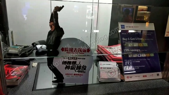 可以看到,這個宣傳品可以是向左和向右不斷搖擺。其實這款搖擺的票房宣傳品,較早前在安樂發行、馬東石主演的韓片《神臂大叔》也曾見過,不過是次的宣傳看來效果更佳。各位倘若周末經過旺角百老匯戲院的話,不妨多加留意好了。