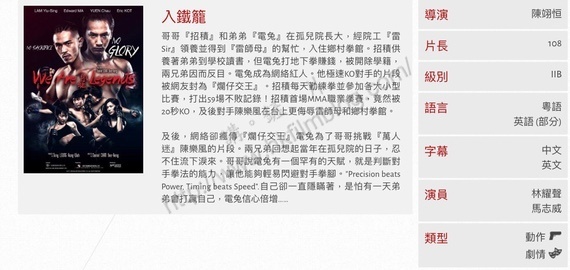 而在其電影網站裡,亦看到電影《入鐵籠》的介紹,該片片長為108分鐘,電影描述兩兄弟在孤兒院長大,其餘經院工領養入住鄉村團館。其後關乎MMA職業團賽的故事。
