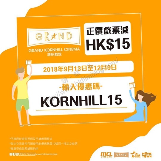 上圖所見,便是Grand Kornhill Cinema的最新票價優惠,觀眾於9月13日至12月9日期間,透過MCL戲院網站購買Grand Kornhill的正價戲票,可以便用優惠碼,享有十五元的票價優惠,即使扣除了網上購票手續費,整體費用仍較票房購買便宜。
