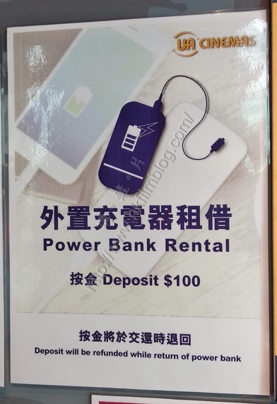 上圖所見,便是「講。鏟。片」情報人員日前於尖沙咀UA iSquare戲院所攝,可以看到該戲院貼出通告,顯示提供外置充電器租借服務,有意租借的觀眾只需提供按金一百元,便可獲得借用外置充電器,同時在交還充電器時便可取回按金。