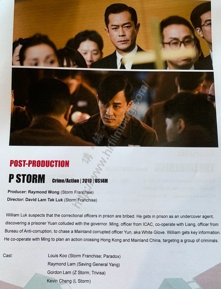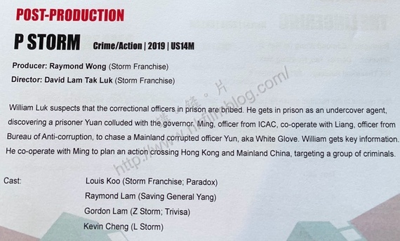 上圖所見,便是今年釜山國際電影節期間舉行的亞洲電影市場裡,東方影業提供的片目,當中可以看到電影《P風暴》已踏入後期製作階段,並且預計在2019年上映,而製作費為千四萬美金,意味著製作費達一億港元。資料顯電影由黃百鳴監製、林德祿執導,當中演員陣容包括了整個「風暴」系列與《殺破狼.貪狼》的古天樂、《忠烈楊家將》的林峰、《Z風暴》與《樹大招風》的林家棟,以及《L風暴》的鄭嘉穎。