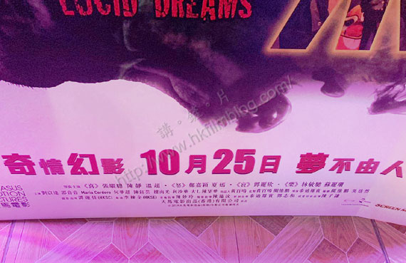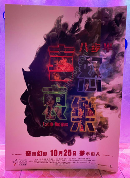 上圖所見,便是「講。鏟。片」情報人員在銅鑼灣Cinema City Victoria所攝,可以看到電影《八步半喜怒哀樂》的宣傳紙板,以白色作背景,而黑色部分看到一個人的側面輪廓,而左方仿如煙燒雲散一樣,而「喜」、「怒」、「哀」、「樂」四紙則分別以紅、藍、綠、黃的色調配上故事裡的劇照,下方則寫上「奇情幻影10月25日夢不由人」的點題字眼。