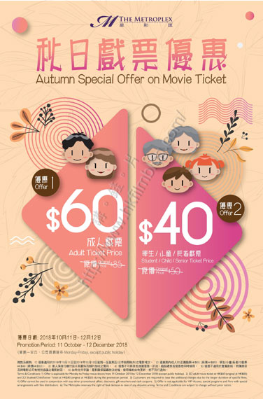 上圖所見,便是星影匯推出的秋日戲票優惠,主要是為非公眾假期的星期一至五2D場次提供票價惠,當中成日票價只需六十元,較原價八十五元下調達廿五元,而學生、小童與長者戲票亦由五十元下調至四十元。而優惠期由十月十一日至十二月十二日,較UA MegaBox提供的優惠長。