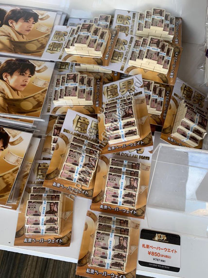上圖所見,便是「講。鏟。片」讀者在日本提供的圖片,可以看到該處同埋有以鈔票製作成的道具,不過是次並不是紙巾,而是一個仿如一疊鈔票的道具。而這個道具原來是剛在日本開畫由大友啟史執導,佐藤健與高橋一生主演的電影《億男》的宣傳品。不過論其實用性,似乎香港的鈔票紙巾也許更勝一籌。