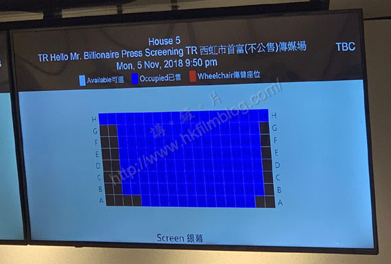 上圖所見,便是「講。鏟。片」情報人員昨晚於九龍灣MCL德福戲院大堂所攝,當時顯示了戲院的售票情況,當中以五院晚上九時五十分的場次最為有趣,因為電腦屏幕顯示全院滿座,並且寫上「西虹市首富(不公售)傳媒場」的字眼。