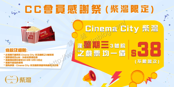 上圖所見,便是Cinema City柴灣戲院最新提供的優惠,並且以「CC會員感謝祭」為名,逢星期三Cinema City柴灣三院的票價均為38元,較2D成日票價65元便宜達27元,而有關優惠則直至今年12月12日為止。