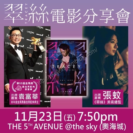 上圖所見,便是來自電影《翠絲》的官方Facebook專頁,可以看到這部昨天已正式上映由天下一發行、舒琪與廖婉虹監製、李駿碩執導的電影將於今晚在The Sky的The 5th Avenue範圍進行電影分享,當中出席者包括了憑《翠絲》勇奪出爐金馬獎最佳男配角袁富華,以及《翠絲》美術總監張蚊。