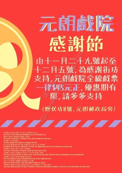 上圖所見,便是元朗戲院在其官方Facebook所張貼的通告,可以看到該戲院由十一月廿九日至十二月五日為感謝街坊支持,全線票價一律為四十五元。比起平日正場正價七十大元一票,確實便宜了不少。