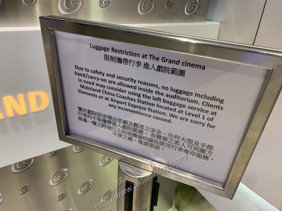 上圖所見,便是「講。鏟。片」情報人員近期於九龍站The Grand所攝,可以看到該戲院近期特別於票房位置及入場處張貼了「限制攜帶行李進入戲院範圍」的通告,當中表明基於保安理由並顧及觀眾安全,觀眾不能攜帶大型與手提行李。同時指出觀眾可便用商場一樓跨境巴士站或機場快線站的行李寄存服務。