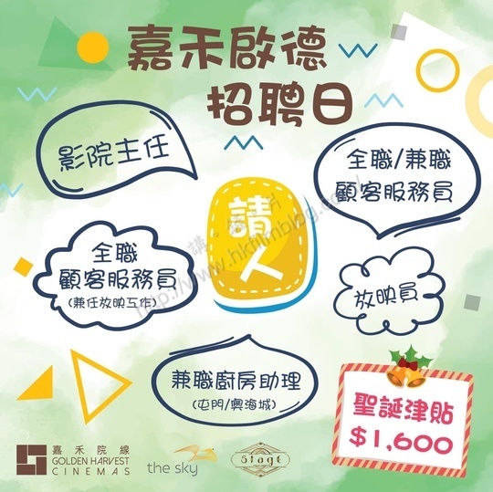 上圖所見,便是「嘉禾啟德招聘日」的廣告,可以看到該戲院招聘多個職位,當中包括全職與兼職顧客服務員、放映員與影院主任,同時為屯門Stage與奧海城The Stage招聘兼職廚房助理。但是最為有趣的是,右下角出現「聖誕津貼$1,600」。