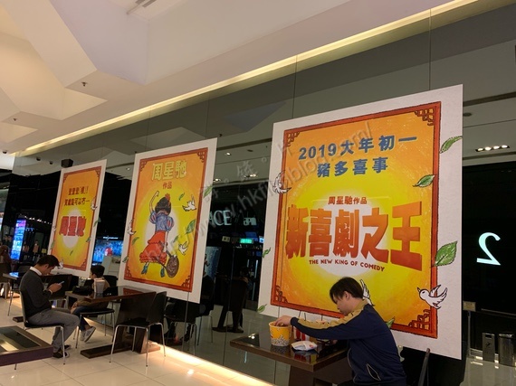 上圖所見,便是「講。鏟。片」情報人員在觀坮中Palace apm戲院大堂所攝。可以看到該戲院大堂已經在鏡頭的牆身,貼上了三幀正方形的《新喜劇之王》大型宣傳品。當中的內容,其實跟其初版預告片段相若。