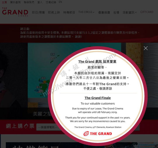 上圖所見,便是The Grand的主頁,今早出現「The Grand戲院結束營業」的消息,指由於租約期滿,現擬於二月廿八日為最後營業日期。
