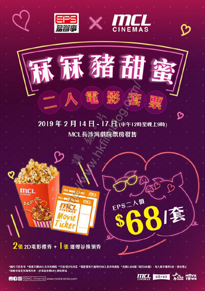 情人節作為戲院推廣,可以有不同的層面。有戲院便趁著情人節推出應節套餐,亦有戲院趁著新開業之時,推出電影推出。當中MCL院線便跟EPS合作,推出「冧冧豬甜蜜二人電影套票」。