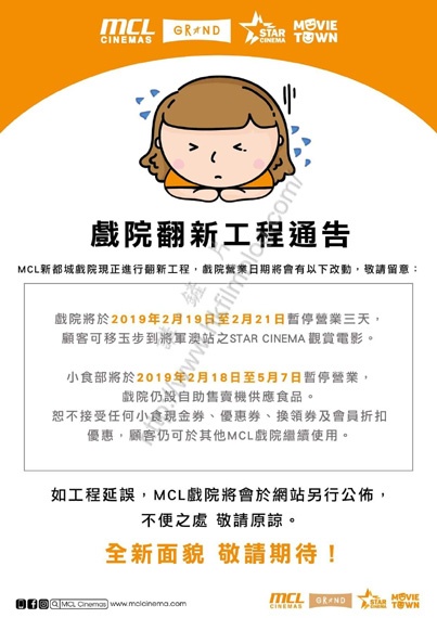 上圖所見,便是MCL新都城戲院的通告,當中顯示該戲院於二月十九日至二月廿一日暫停營業三天,觀眾可到將軍澳站的Star Cinema觀賞電影。與此同時,該戲院的小食部於二月十八日至五月七日暫停營業,改為以自助售賣機提供食品,惟以此則不會提供會員折扣優惠。