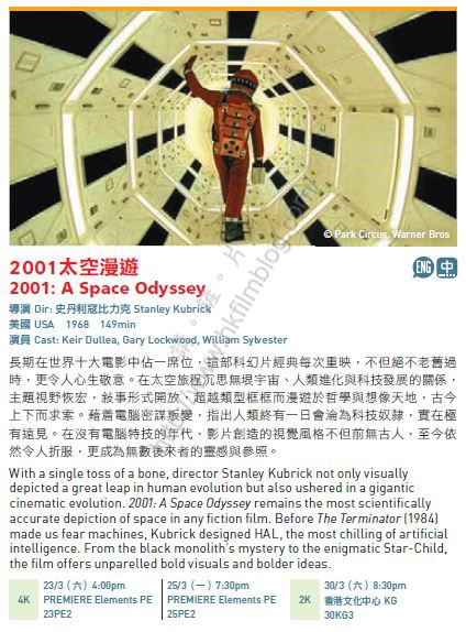 如斯的不同情況,其實也跟各場地的放映器材有關。由於香港文化中心大劇場是多年前安裝數碼放映機,當年也只有2k解像度,故此有所限制。不過觀乎目前兩場4k版本《2001太空漫遊》均已告滿座,看來要在香港看到4k版本,也許只能盼望電影節加場好了。