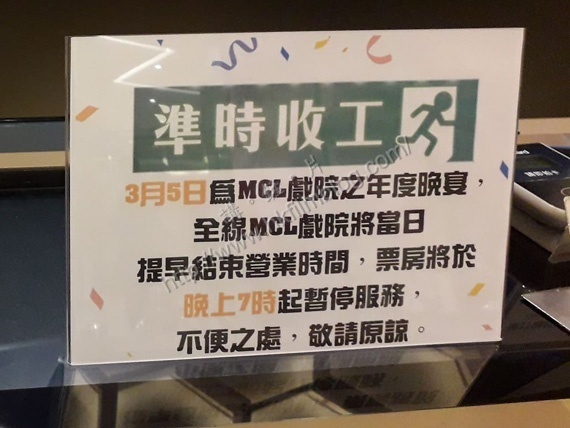 上圖所見,便是其中一間MCL戲院所攝,可以看到該戲院貼出了通告,指今天為MCL戲院的年度晚宴,全線MCL戲院將會提早休業,當中票房便會在晚上七時起暫停服務。其實如斯的做法,較早前在其他院線也有相若的安排,讓前線員工也可以出席晚宴。