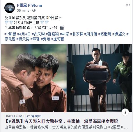 近年來,反貪題材仿如是禾電影的一條血路一樣。當中尤以黃百鳴監製、林德祿執導的系列拍到一部接一部。正當去年八月才上映第三部曲《L風暴》時,第四部曲《P風暴》已經拍攝完成,如今更確定將於四月四日在港上映。