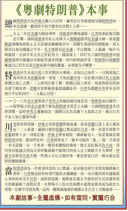 先來看看這個報章廣告,當中宣句語又有「熱烈祝賀香港粵劇聯合國申遺成功邁向10周年紀念」,但右上角又配合近年大灣區概念寫上「大灣區精神文化戲曲為先」。當中還要說明表達的人物,當中包括毛澤東、周恩來、江青、特朗普、川普、尼克遜、金正恩、李雪主與伊萬卡。