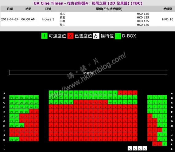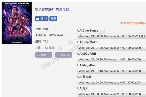 不過,說到最早的場次,卻要數到位於銅鑼灣時代廣場的UA Cine Times,該戲院五院2D全景聲《復仇者聯盟4終局之戰》於四月廿四日早上開出早上六時正的場次,承惠125元的票價,在接近下午四時已賣得七七八八。