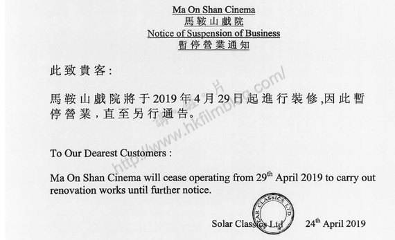 位於馬鞍山新港城中心的馬鞍山戲院,於日前發出通告,指戲院由今天起進行裝修並暫停營業。據了解,是次暫停營業裝修,同時也會將其經營權轉手。