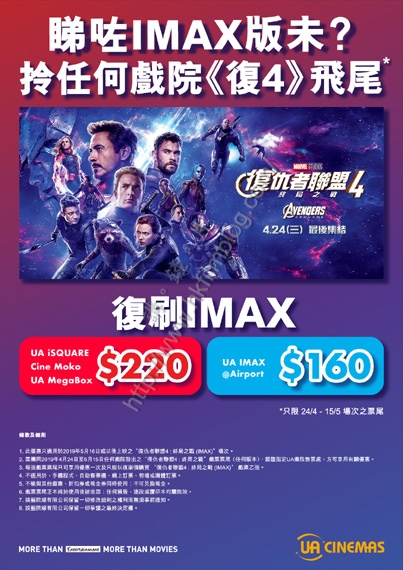 上圖所見,便是UA院線提供的最新推廣優惠。觀眾憑著四月廿四日至五月十五日任何戲院發出《復仇者聯盟4終局之戰》任何版本戲票,到指定UA戲院售票處購買五月十六日或以後上映該片的IMAX版本場次,便可以享有優惠。當中UA iSquare、UA Cine Moko與UA MegaBox票價為220元,而機場IMAX戲院為160元,較開畫日票價有約30元至70元的優惠。