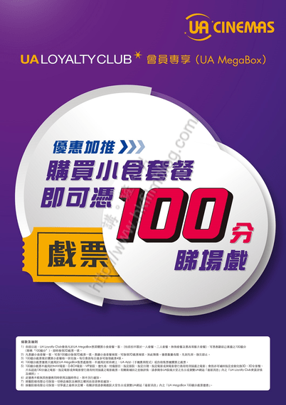 上圖所見,便是UA MegaBox提供的優惠通告,其實是次提供了共三個優惠,不過最常見的,要算是這個在該戲院購買小食套餐,便可憑會員一百積分來換取2D戲票一張。其實這個優惠過去亦有提供,不過是次不同的是,這次提供的優惠沒有限期。