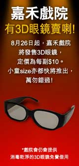 上圖所見,便是嘉禾旗下戲院的最新通告,內容指他們提供零售的3D除了有大家見慣見熟的成人版本外,還有小童版本,至於售價則為十二元正。值得留意的是,目前其他戲院未有提供小童版3D眼鏡發售。