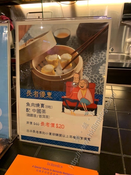 上圖所見,便是「講。鏟。片」在昨天端午節假期㫢於油麻地百老匯電影中心所攝,可以看到該戲院小食部提供了長者優惠茶餐。當中包括魯肉燒賣八粒,再配上中國茶,而中國難則可在鐵觀音與普洱茶中來選擇。該套餐原價為四十元,而長者出示長者票到小賣部購買這個茶餐,則可享長者價二十元,比起原價平了一半。