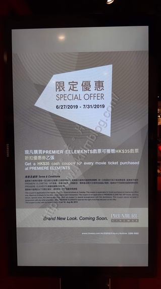 位於九龍站圓方商場的戲院,自三月一日由百老匯院線接手成為Premiere Elements後,過去數月來的戲院入座似乎只是一般。戲院也許希望進一步吸引觀眾前來,於是即使是在暑期旺角,也來推出優惠。