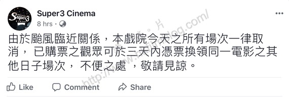上圖所見,便是新光戲院大劇場Super 3 Cinema在其官方Facebook專頁於今早發出的通告,指由於颱風臨近,該戲院今天全數場次一律取消,已購票的觀眾可在三天內,憑戲票換領同一電影的其他日子場次。