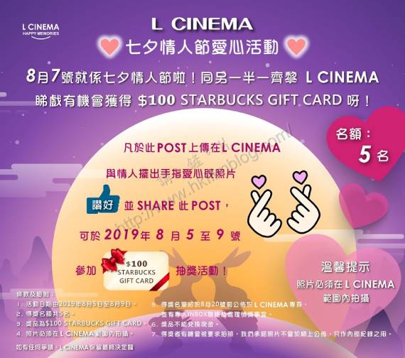 而位於筲箕灣的L Cinema,則提供了七夕情人節活動,於八月五日至九日上傳在L Cinema與情人擺出手指愛心的照片至官方Facebook專頁,便可參加抽獎活動,有機會獲得一百元星巴克咖啡店禮物券。