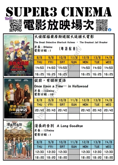 上圖所見,便是新光戲院大劇場於八月七日發佈的八月八日至八月十四日Super 3戲院放映時間表,可以看到該戲院將會放映兩場《大偵探福爾摩斯:逃獄大追捕》、兩場《漫長的告別》與一場《從前,有個荷里活》,而且每天放映時間相同。不過,可以看到三部電影均在周日沒有場次,意味著戲院於今天停業。