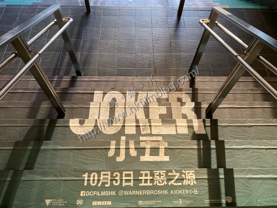 華納發行、以DC漫畫人物改編而已的電影《小丑》(Joker)將於十月三日在香港上映。而上圖所見,便是「講。鏟。片」情報人員日前於尖沙咀嘉禾旗下的海運戲院所攝,可以看到整道海運戲院的樓梯,均成為了《小丑》的宣傳,同時也看到主角小丑的宣傳。而不少觀眾到戲院時,更是拿起相機來合照。