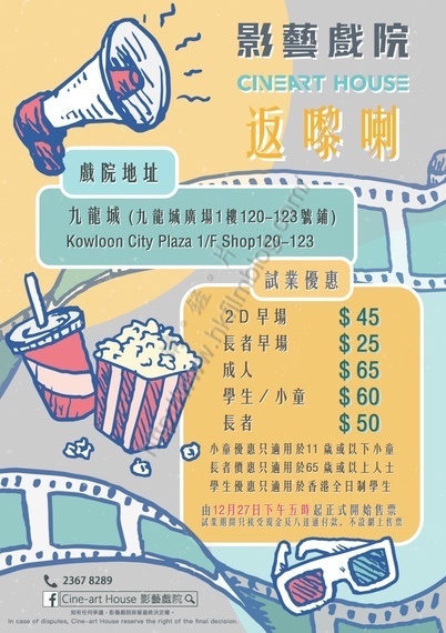 上圖所見,便是影藝戲院在官方Facebook的通告,可以看到位於九龍城廣場一樓的影藝戲院,將於明天下午五時起正式開始售票,同時也公佈了票價,當中2D早場票價為45元,長者早場為25元,而成人票價為65元。而試業期間,影藝戲院只接受即場現金與八達通付款,不設網上售票。