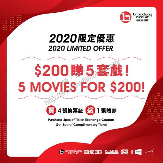 據了解,是次百老匯院線推出的套票,讓觀眾可以用「賀年價」二百元的價錢,購買到四張換票証與一張贈券,合共可看五部電影。而是次除了金鐘AMC Pacific Place、中環PALACE ifc與數碼港百老匯外,其他百老匯旗下戲院均會限售票五百套套票,而B+ cinema apm則會推出七百套。