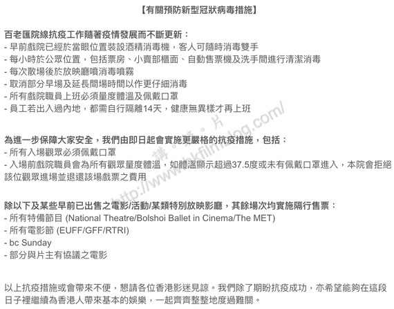 觀乎香港各家主要院線的應對方案,雖然有所微調,不過目前主要的措施大概分為幾方面。當中包括加強戲院清潔、將間場時間延長以便清潔、散場後噴上消毒噴霧,職嚶山需要量度體溫及戴上口罩,而且需要觀眾入場戴上口罩,還需要作體溫測量,超過攝氏37.5度或未有戴上口罩可拒絕入場等。有些則採取隔行售票或縮短營業時間,不過並沒有停業。