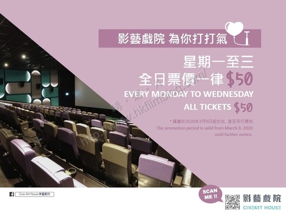 上圖所見,便是位於九龍城廣場的影藝戲院推出的通告。該戲院從三月九日,即下星期一起,星期一至星期三的全日票價,均一律為五十大元。而且有關的優惠,更是直至另行通知為止。