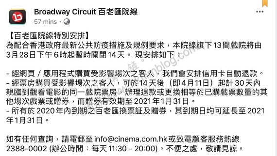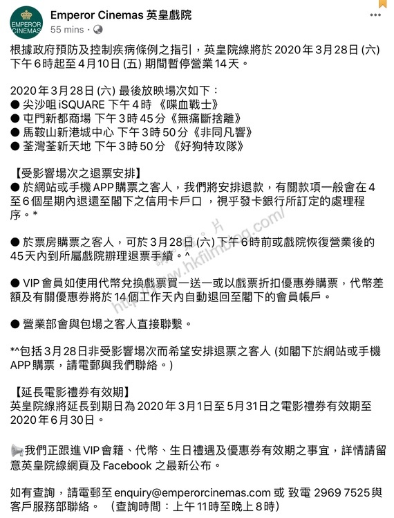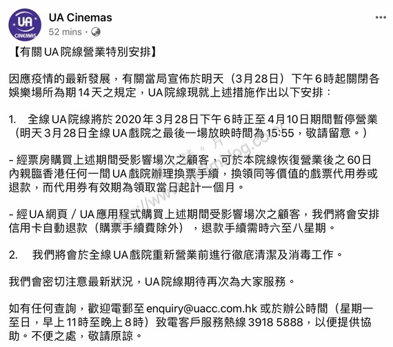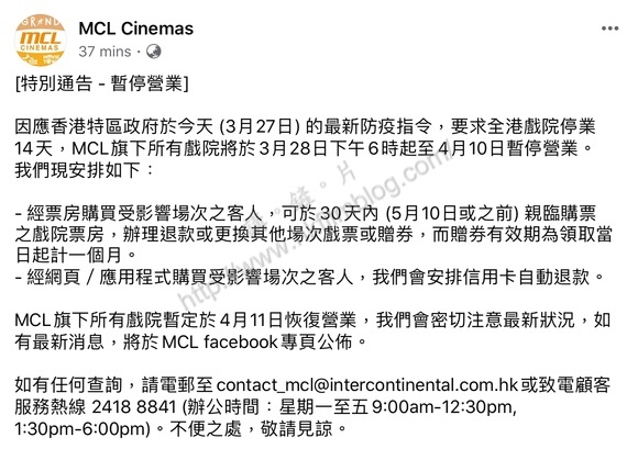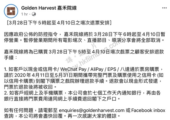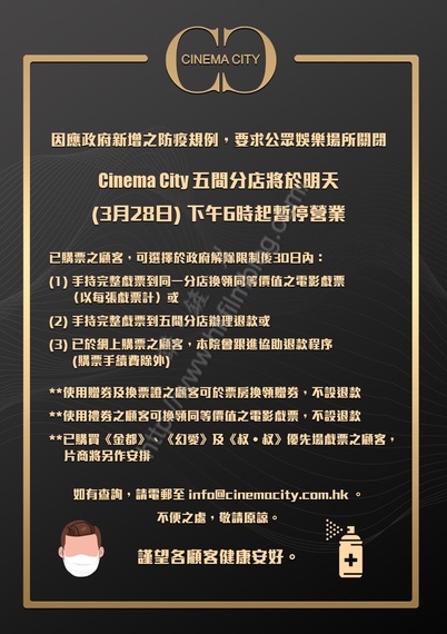 因應政府於今天傍晚公佈的最新防疫措施及法例,香港的所有戲院由明天下午六時起需要停業十四天,暫時停業至四月十日。由於事出突然,不少觀眾也許已預購戲票。而不同院線亦相繼在官方Facebook專頁公佈了票務安排。