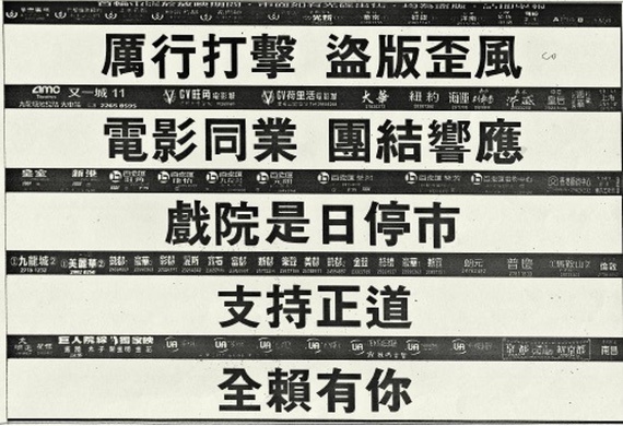 上圖所見,便是一九九九年三月十七日的港九戲院聯合廣告,當時全港戲院停業一天,主要是為了反盜版。而在當天的聯合廣告,則寫上「厲行打擊盜版歪風,電影同業團結響應,戲院是日停市,支持正道全賴有你」的字眼。