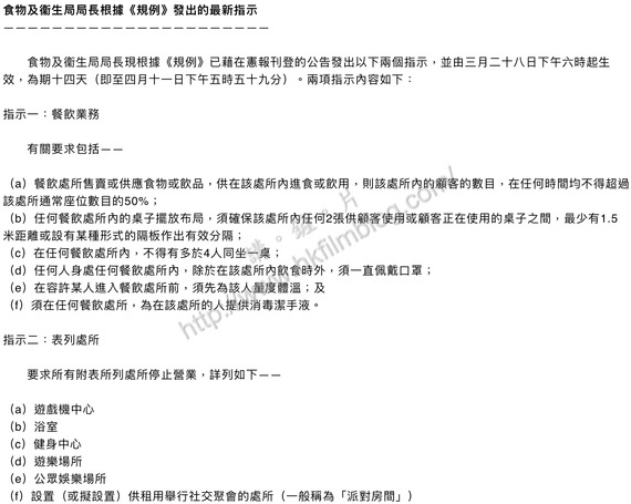 先來看回政府的新聞稿,大概已經列出了是次食物及衞生局局長的指示,當中戲院屬於指示二的「公眾娛樂場所」,故此需要停業營業,而根據指示,停止營業時間由三月二十八日下午六時起至四月十一日下午五時五十九分。這意味著即使戲院可以於四月十一日重開,也只能於下午六時後才可以開始營業。
